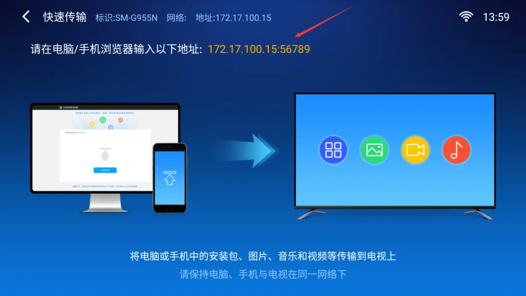 4. 多屏互动:将电脑或手机中的安装包、图片、音乐和视频等传输到电视上,传输时请保持电脑、手机与电视在同一网络下。