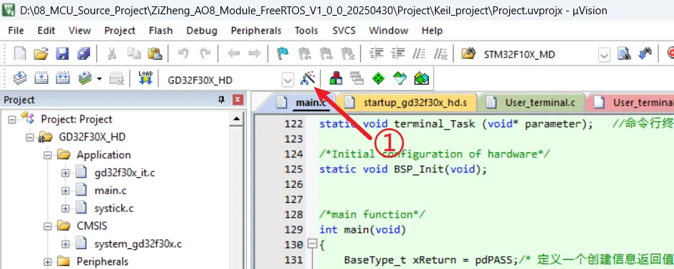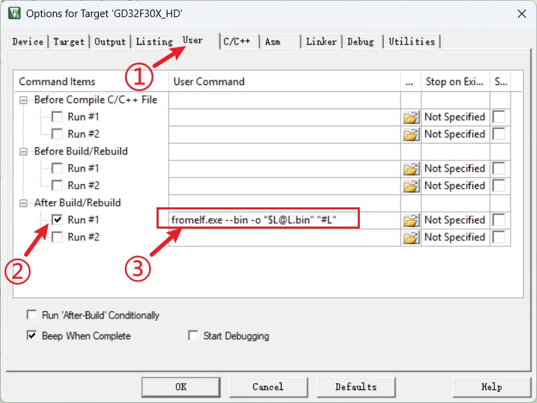 步骤2:①、点击“User”选项卡;②、勾选“Run #1” 表示在构建编译后需要执行此项操作;③、在命令行中写入命令<fromelf.exe –bin -o “$L@L.bin” “#L“>,这个命令的含义解析:fromelf.exe 表示调用ARM编译器提供的ELF格式转换工具,这个工具在keil安装路径的ARM\ARMCLANG\bin\文件夹下;–bin 表示指定输出格式为二进制;-o “$L@L.bin”表示指定输出文件的路径和名称,拆开分析 $L:表示当前项目输出目录的路径(即output文件夹),@L:表示使用当前项目的名称(不带扩展名);“#L” 表示转换的目标文件是Keil编译后生成的ELF文件(也就是.axf或.elf后缀的文件);