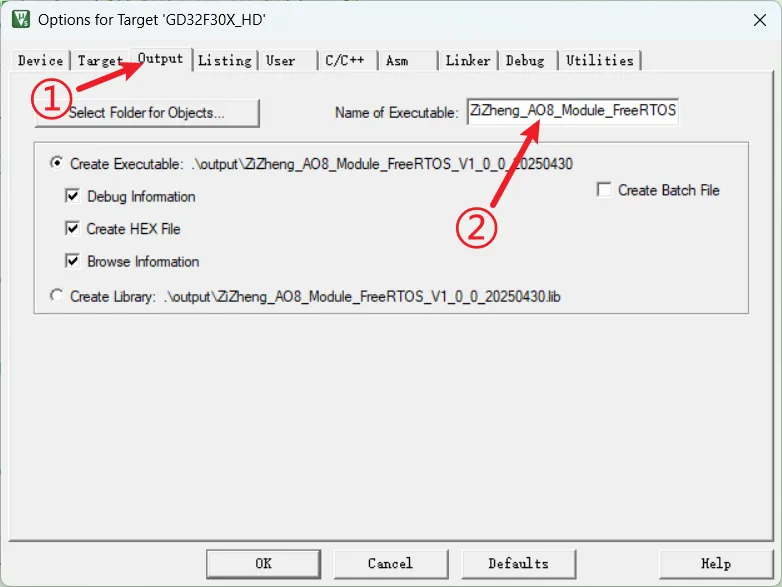 步骤3:①、切换到“Ouput”选项卡;②、设置项目名称,这里设置好的名称就是最后bin文件的名称;设置完成后,点击编译。