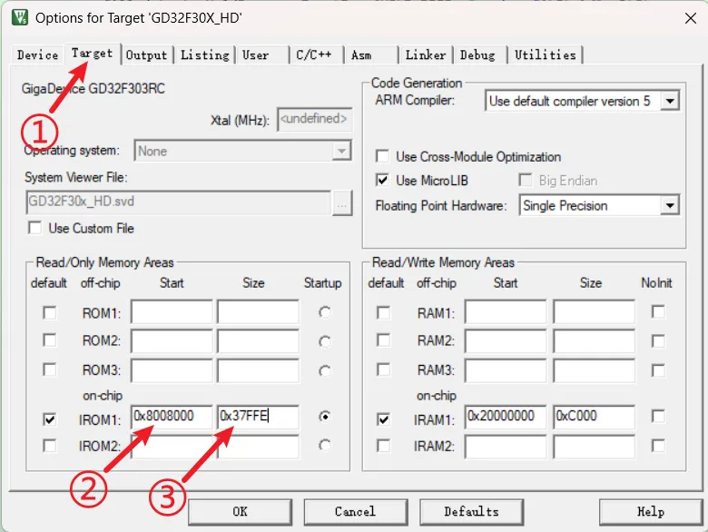实现的方式是先生成Bootloader的.bin文件;①、切换到Target选项卡;②、设置Bootloader的起始地址;③、设置占用空间大小;最后按照上一小节的操作步骤取bin文件。