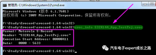 srec_info可以输出S19文件的基本信息,比如在window命令行中输入命令: