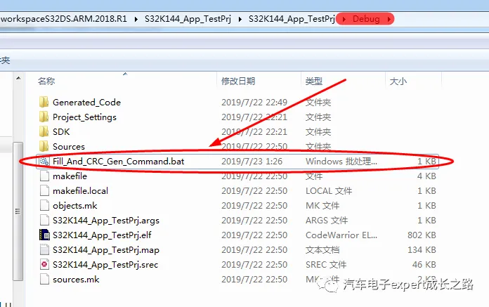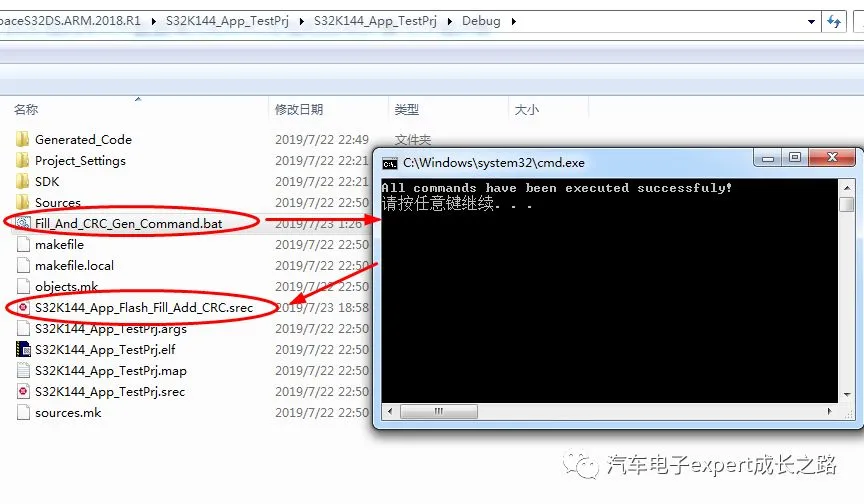 将以上批处理文件–Fill_And_CRC_Gen_Command.bat拷贝到S32K144 S32DS应用工程的编译目标–debug目录下,双击运行即可: