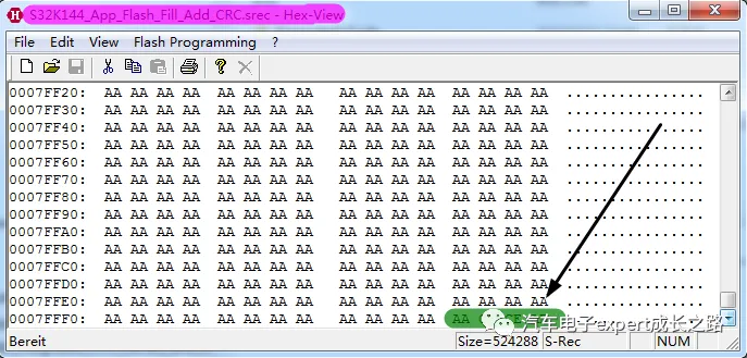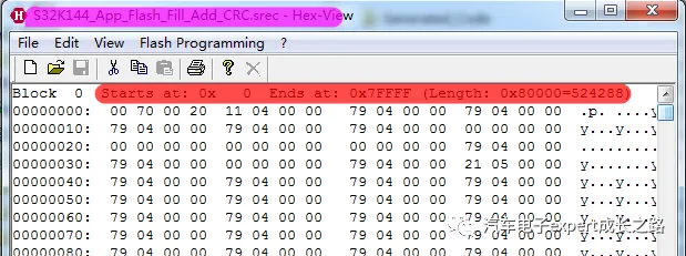 S32K144有512KB P-Flash,地址分布为0x00000~0x7FFFF,因此,配置数据填充(值为0xAA)和CRC校验区域为0x00000~0x7FFFC,校验和结果储存在地址0x7FFFC开始的最后4个字节;