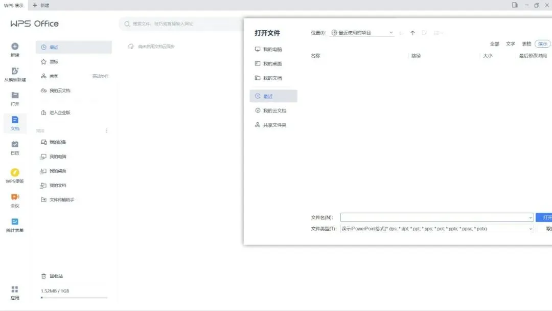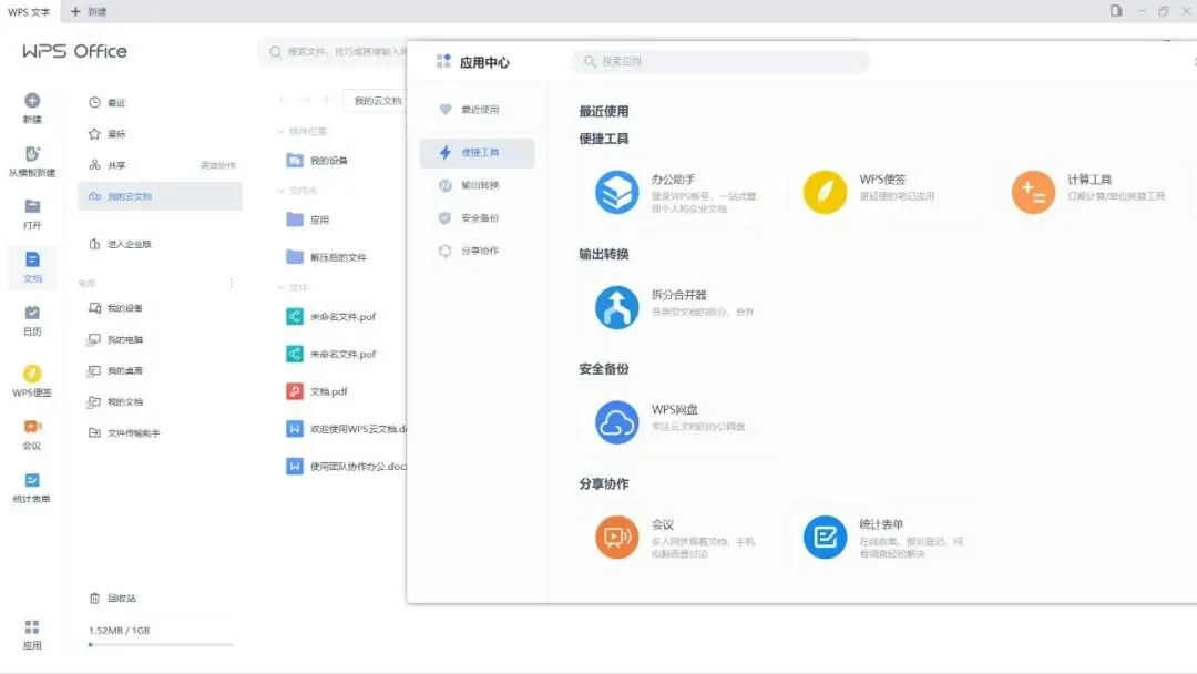 ﹂去界面左侧:日历、WPS便签、会议、统计表单 (广告)