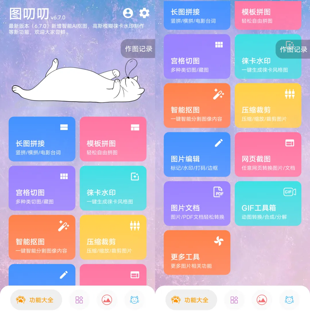 这款APP拥有近百种修图功能,例如长图拼接、宫格切图、抠图、图片压缩等,可以说一切图片相关的功能它都有。