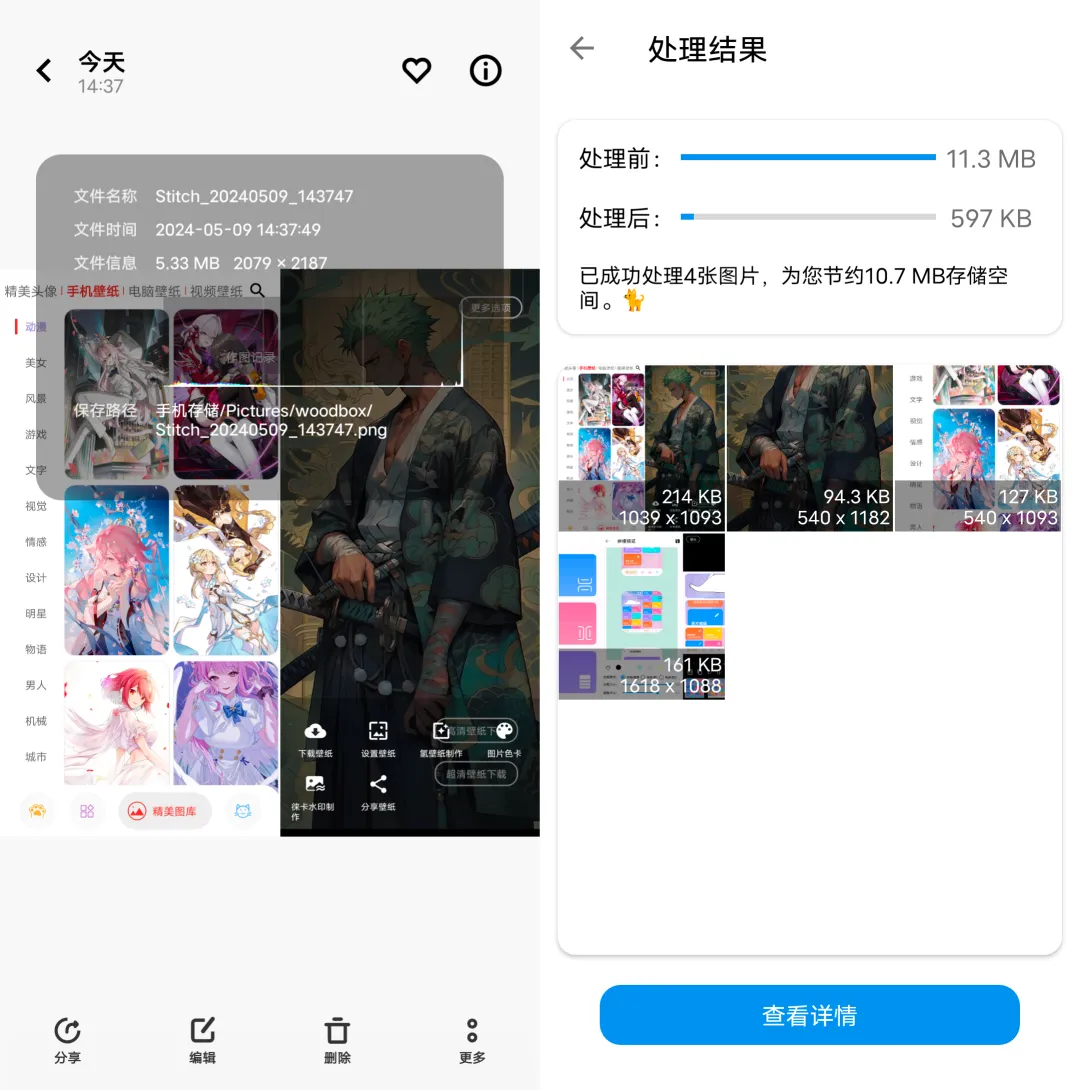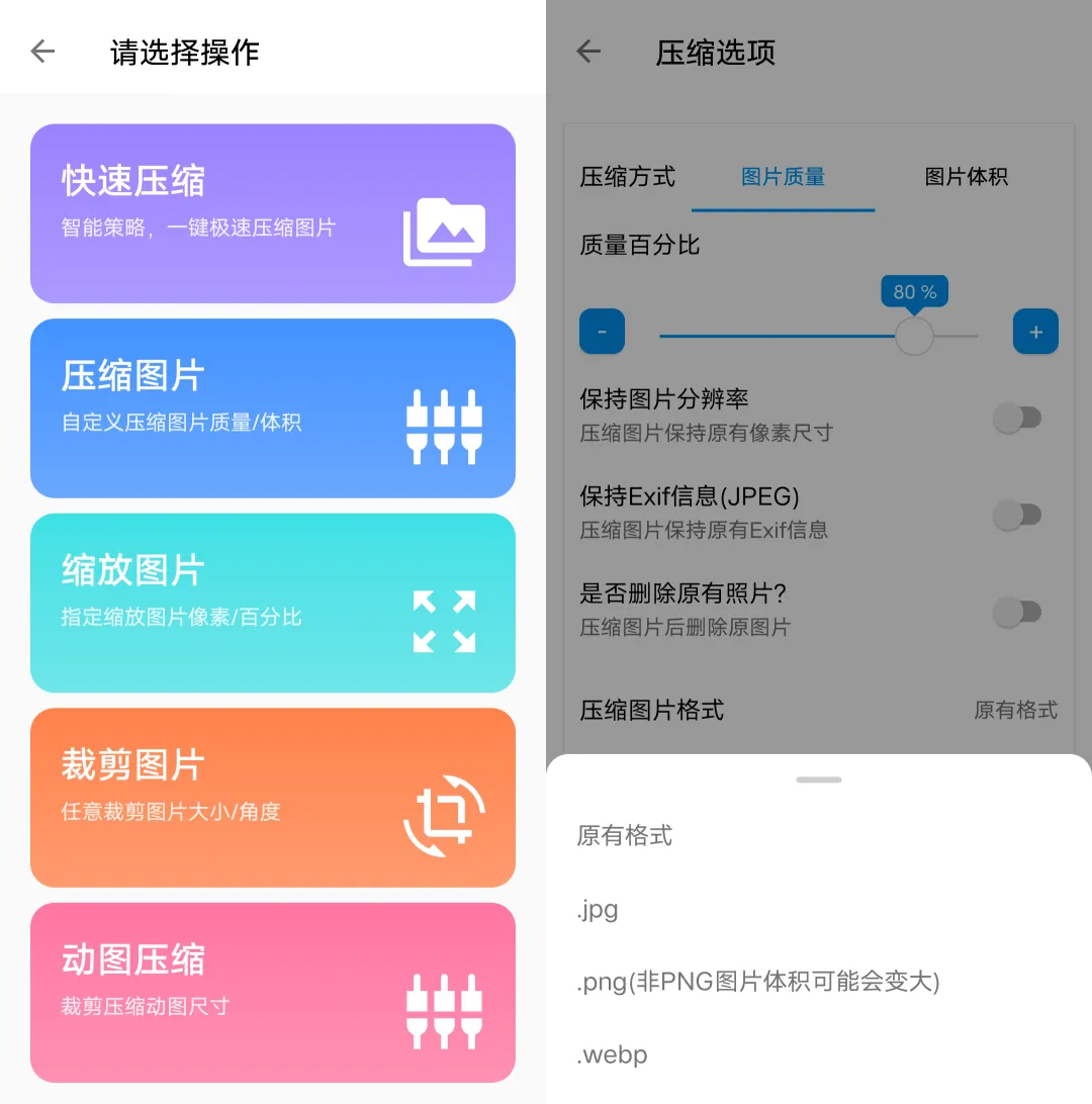 支持压缩图片的质量或体积,支持无损压缩图片,保持图片质量的同时减少存储空间,压缩后的图片可以保存原有格式或jpg、png和webp。