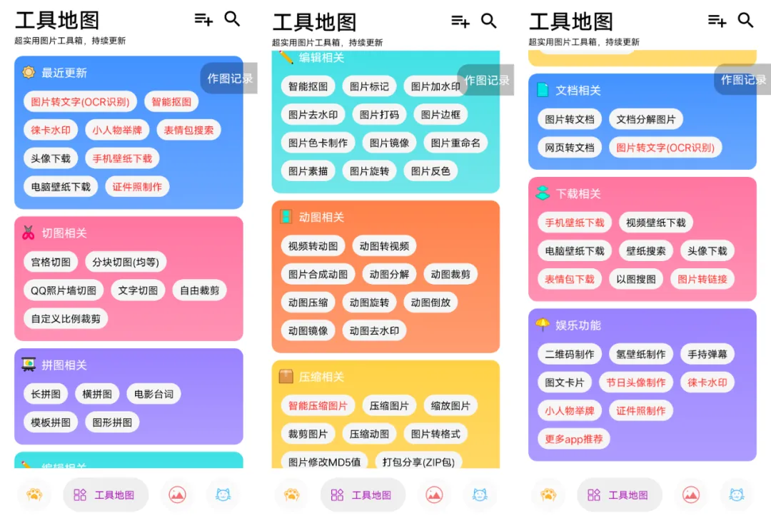 在这个版块中,又细分最近更新、切图、拼图、编辑、动图、压缩、文档等类别,我们可以快速地找到各种用于图片编辑、美化和处理的小工具,且这些小工具将持续更新。