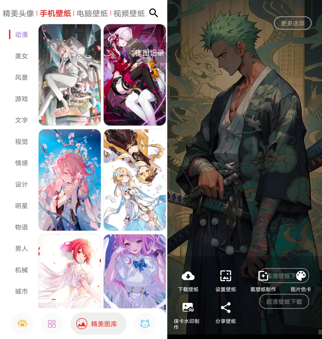 图库版块集成了大量高质量的精美头像、手机/电脑壁纸和视频壁纸,覆盖了各种主题类型,比如动漫、美女、风景、游戏、设计等等,这些图片资源都可以直接下载。