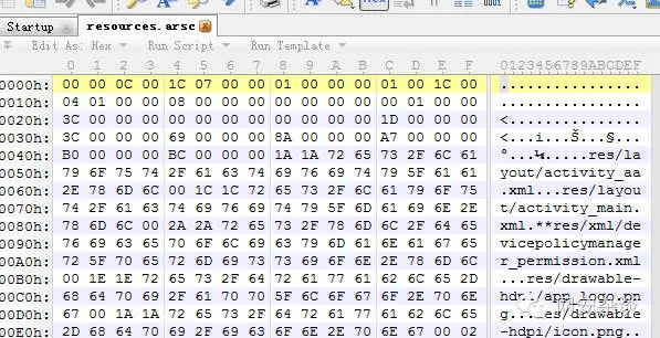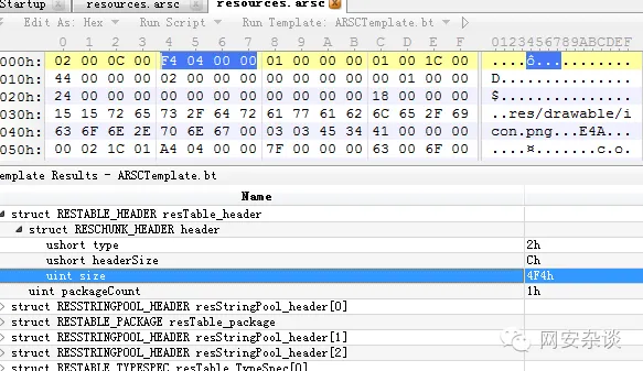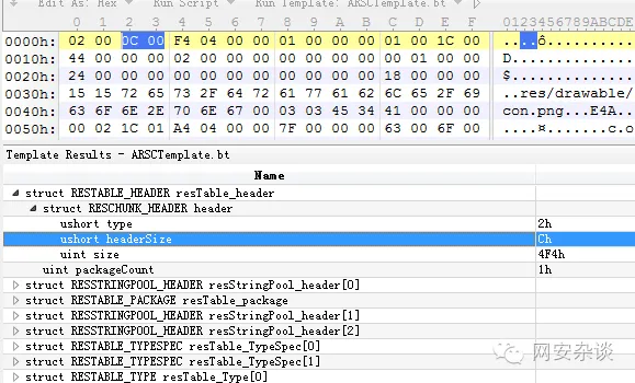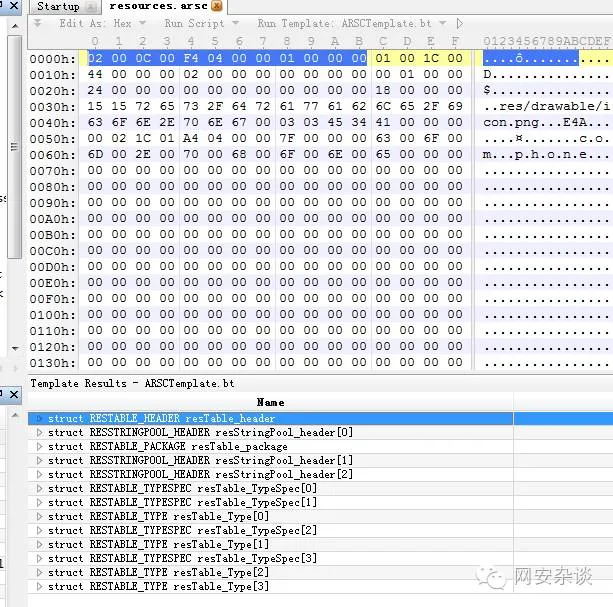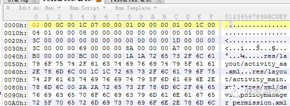 用010editor打开resources.arsc,又没有发现有什么不对的?和我们刚才分析的RESTABLE_HEADER,结合报错信息,确认这个恶意代码的作者是把0200改成了0000,以此制造异常。
