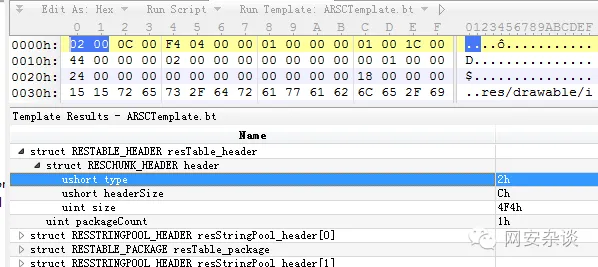 为了便于理解,我们还是通过模版来分析Resources.arsc文件。下载ARSCTemplate.bt模板,用010editor打开模板并运行。(下载地址见http://bbs.pediy.com/showthread.php?p=1416062)