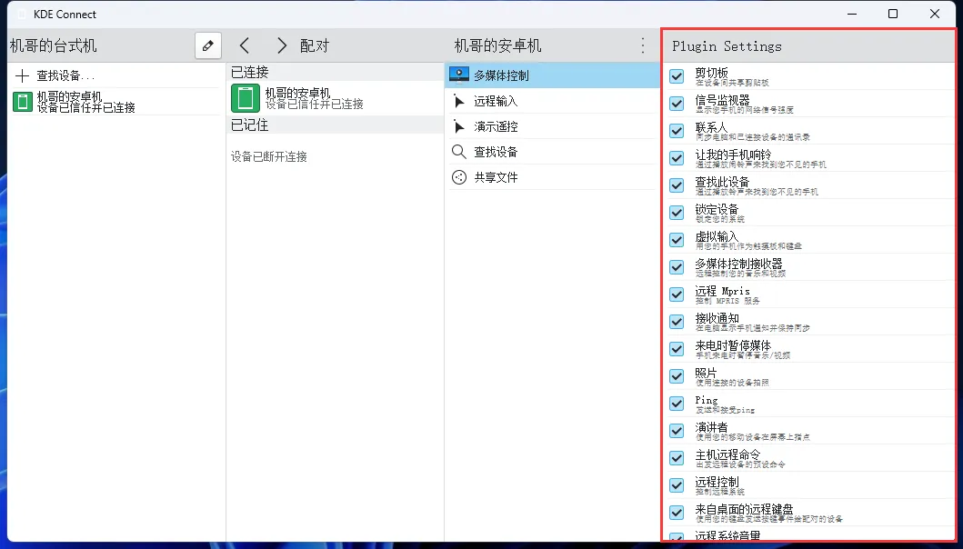 大家可以根据自己的需求,任意开启或关闭插件,来定制出自己心目中的 KDE Connect。