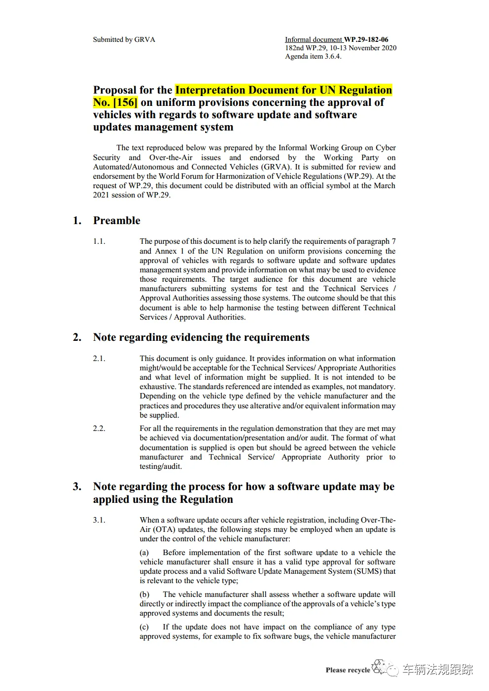 想必大家对六月份发布的三个新法规UNR155/156/157都非常感兴趣,但是又不太看得懂,为了TAA和TS之间能统一尺度,WP29准备发布一份解释文件,草案如下。还有一份网络安全UNR155的,明天分享,敬请期待。