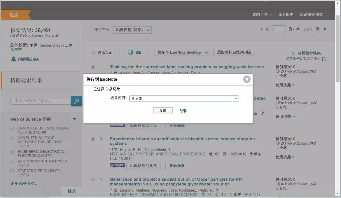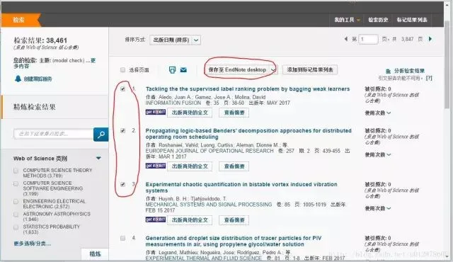 从各大期刊检索网站上面选择需要的文献,使用endnote格式导出到本地。下面以SCI期刊检索为例: