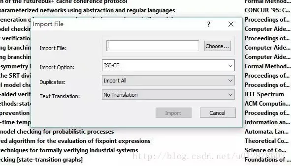 (1) Endnote点击File=>Import=>file 弹出对话框如下。这里Import Option我们选择对应的ISI-CE格式。然后选择我们本地的文件进行导入。