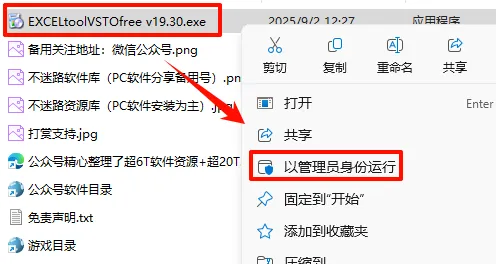 2.打开刚刚解压的文件夹,鼠标右键点击“EXCELtoolVSTOfree v19.30.exe”选择“以管理员身份运行