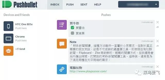 Pushbullet 是一个需要 Google、Facebook 账号登陆使用的电脑手机间传送信息、文件的服务。但是它确实很便捷,速度流畅稳定,而且可以让工作伙伴组成一个群组,群组之间传送文件就会更加方便许多。