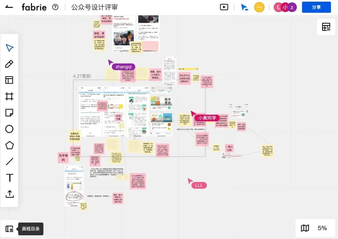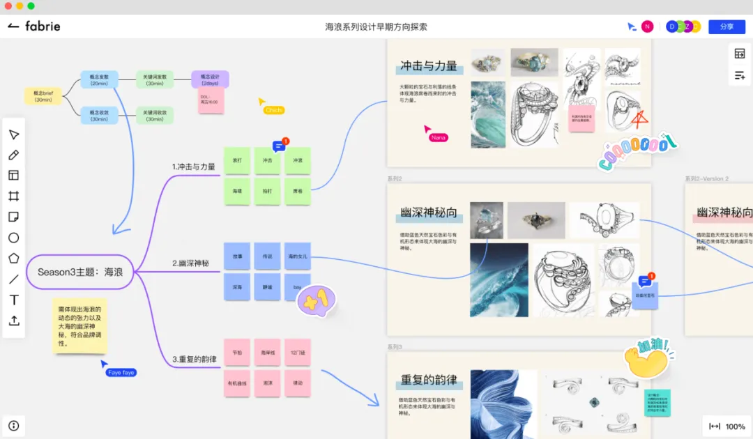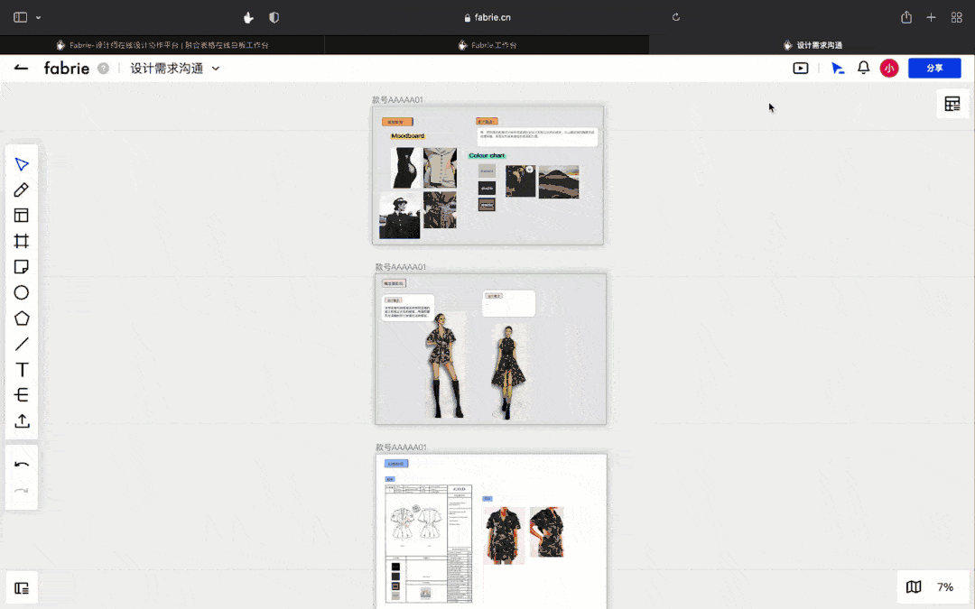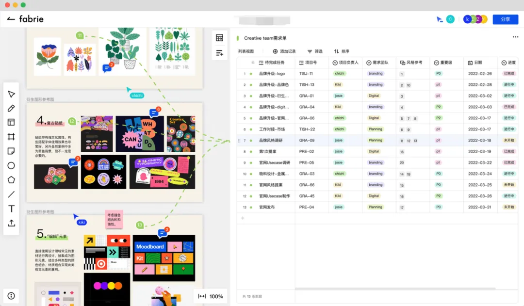 可能有人会发现,Fabrie的一些功能设计非常适合设计师的工作场景。毕竟设计师往往需要搜集大量的素材,做很多市场调研,且工作流程中上下游需要沟通的事情多且杂,Fabrie的在线协作特性可以非常便于团队之间的协作、评审、迭代这些环节,有效地帮助解决设计行业中跨部门、跨公司合作与沟通中效率低下的难题。