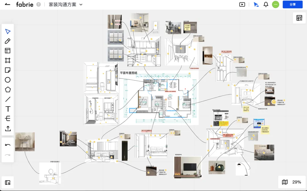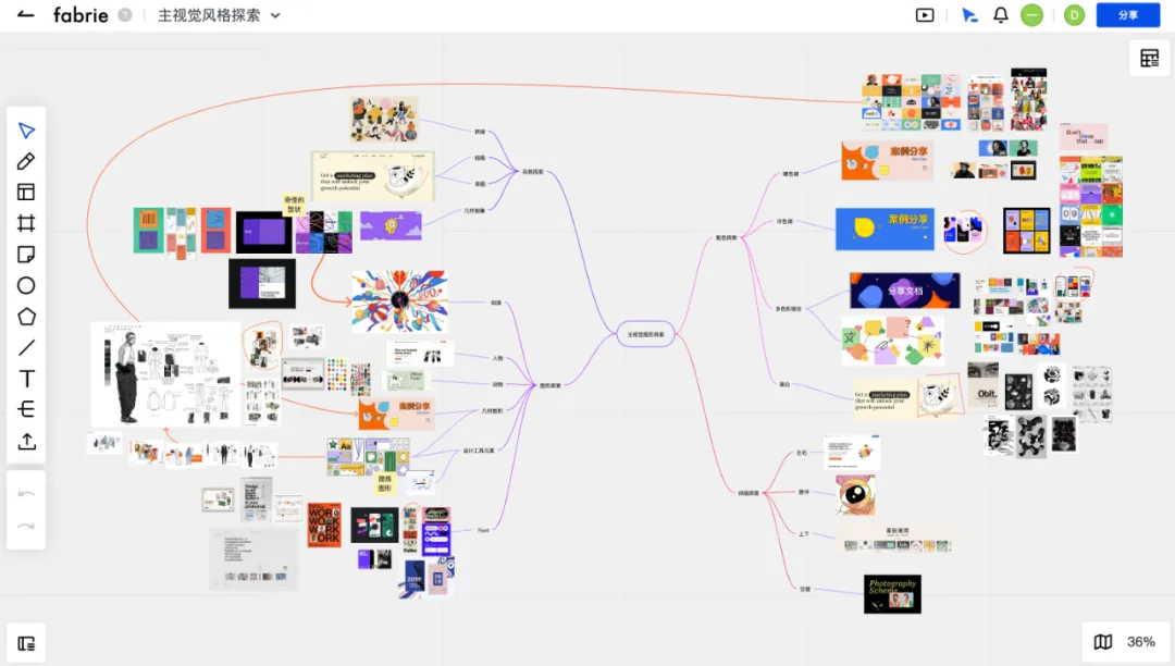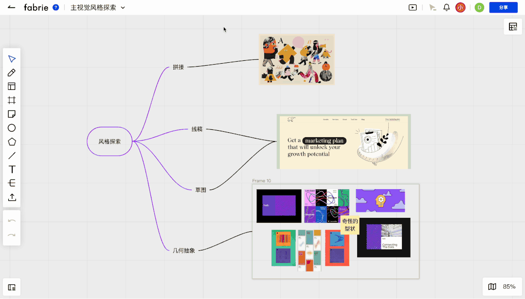 今天给大家推荐的这款叫做 Fabrie 的平台,你可以在上面自由添加图形、照片、文字、便利贴、超链接、思维导图,同时也支持各种本地文件的上传和直接预览,比如PDF、Excel…… 甚至是一个PSD、AI文件(未来还可以支持更多格式的文件)。