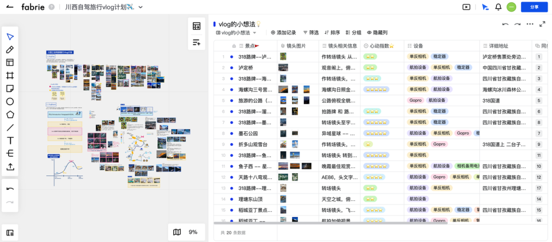 我可以在这个表格上做信息的排序、筛选、分组、计算;可以@成员一起协作;还能通过不同的表格视图查看信息。这让我和朋友一起维护和执行我们的vlog小想法,十分方便~