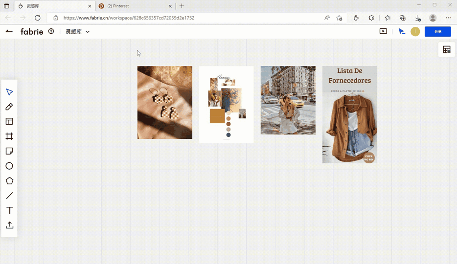 Fabrie有素材收集插件,目前支持采集网页上的图片到Fabrie的素材中转站,不过我发现部分网页的图片素材可以直接拖拽到白板上, 比如pexels、unsplash。官方透露未来还会支持更多类型素材的采集(文章、视频……)