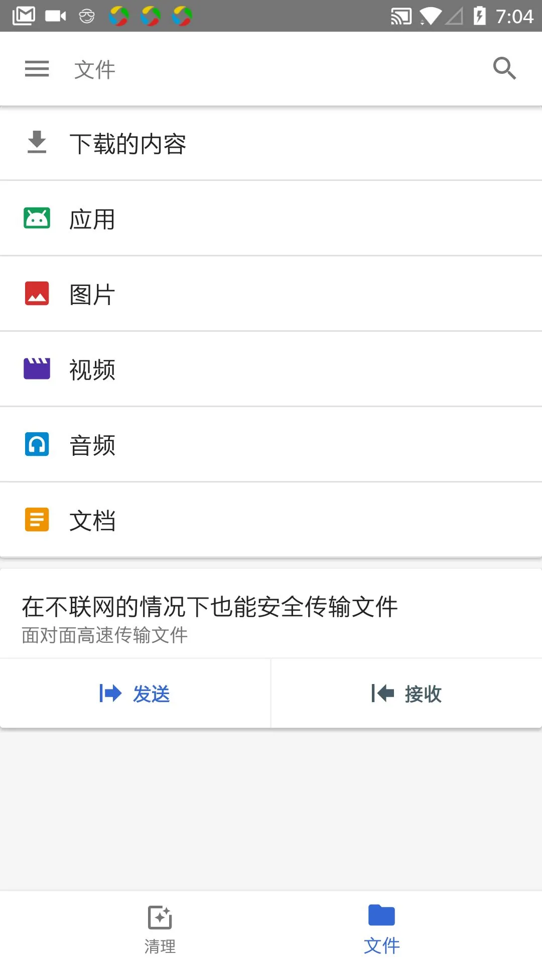 至于文件管理部分,同样简单明了。 App 已经自动把手机里的文件按照类型整理好了。大家只要按照自己的需要查找、管理文件即可。