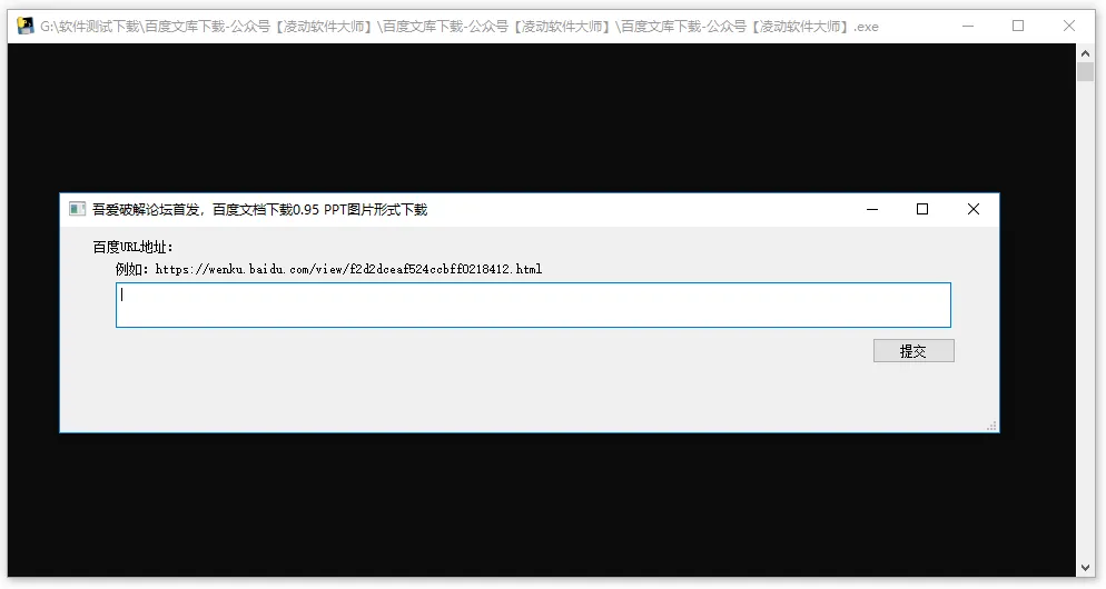 双击打开软件之后,会显示俩个窗口,一个是我们需要粘贴的目标文档地址,另一个是运行程序过程的黑色窗口(注意:不要关闭黑色窗口)。