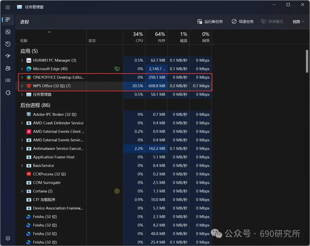 特别是对于使用这种性能不是很强的迷你主机来说,WPS的后台占用内存在五百多兆,而ONLYOFFICE的内存占用仅仅只有三百多兆,这一点对于性能比较弱的设备来说真的很友好。