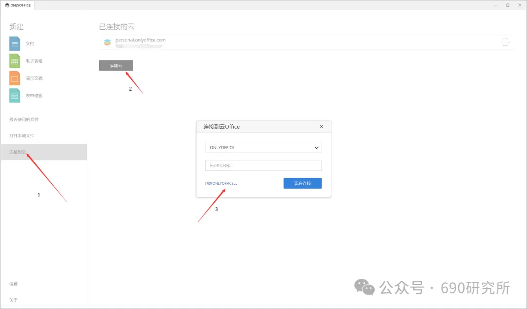创建的方式也很简单,在ONLYOFFICE的软件内点击连接到云,选择ONLYOFFICE,并创建ONLYOFFICE云跳转到网页创建即可。