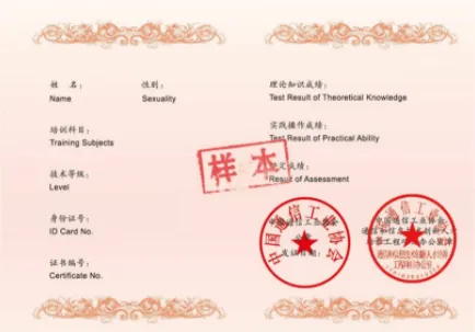 中国通信工业协会颁发的职业技能水平证书将按照统一标准对于通过考试的学员颁发专业“职业技术水平证书”高级认证,该证书表明学员能够熟练运用基本技能和专门技能完成较为复杂的、非常规性的工作,可以掌握本职业的关键技能技术,能够独立处理和解决问题,在技能技术方面有创新,能组织指导他人进行工作,能培训一般操作人员,具有一定的管理能力。