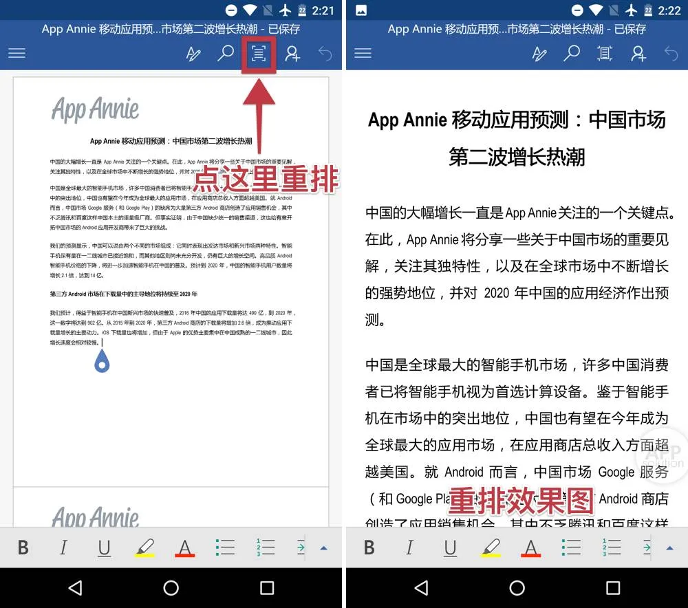 它能将文档以适合手机阅读的版式呈现,同时又不改变文档原有的版式。效果怎样?看下面这个对比图就知道: