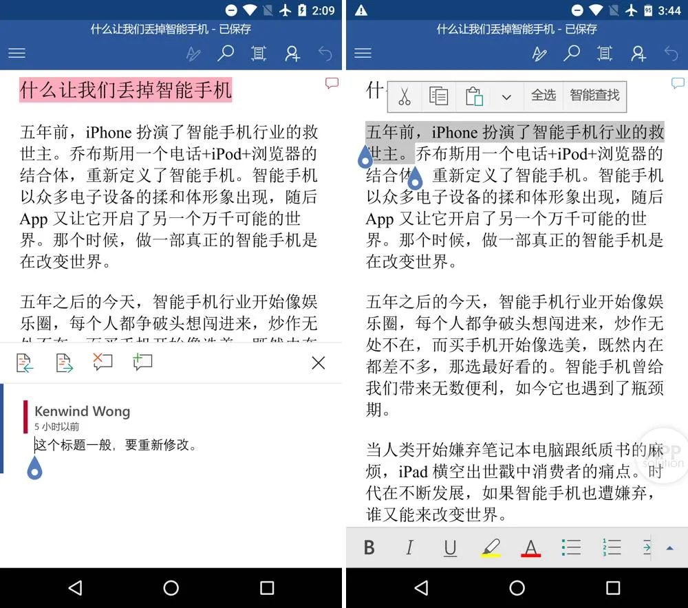 而手机版 Word 提供了完整的批注支持:它可以完整展示不同人的批注,他们对哪一部分有什么修改意见,你在手机上就可以轻松看到。