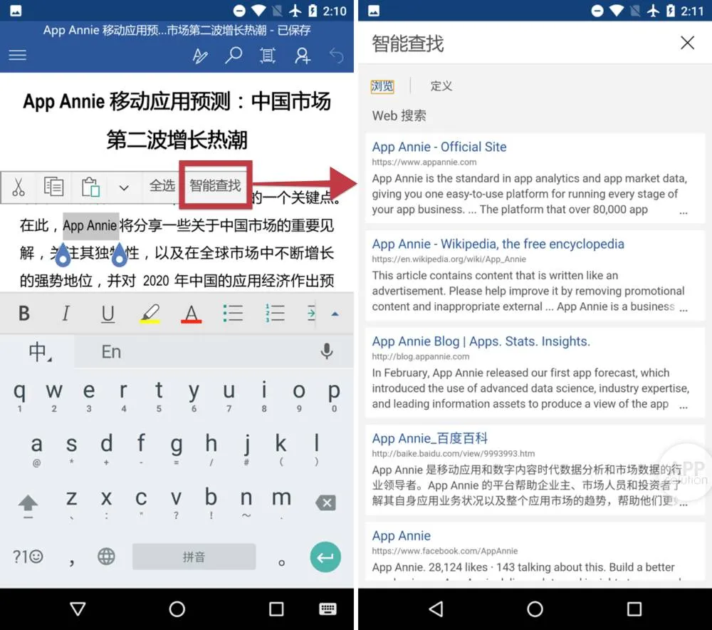 这个时候就可以使用 Word 内置的「智能查找」功能,一键通过 Bing 搜索相应的关键词,简直是成人版的「哪里不会点哪里」。