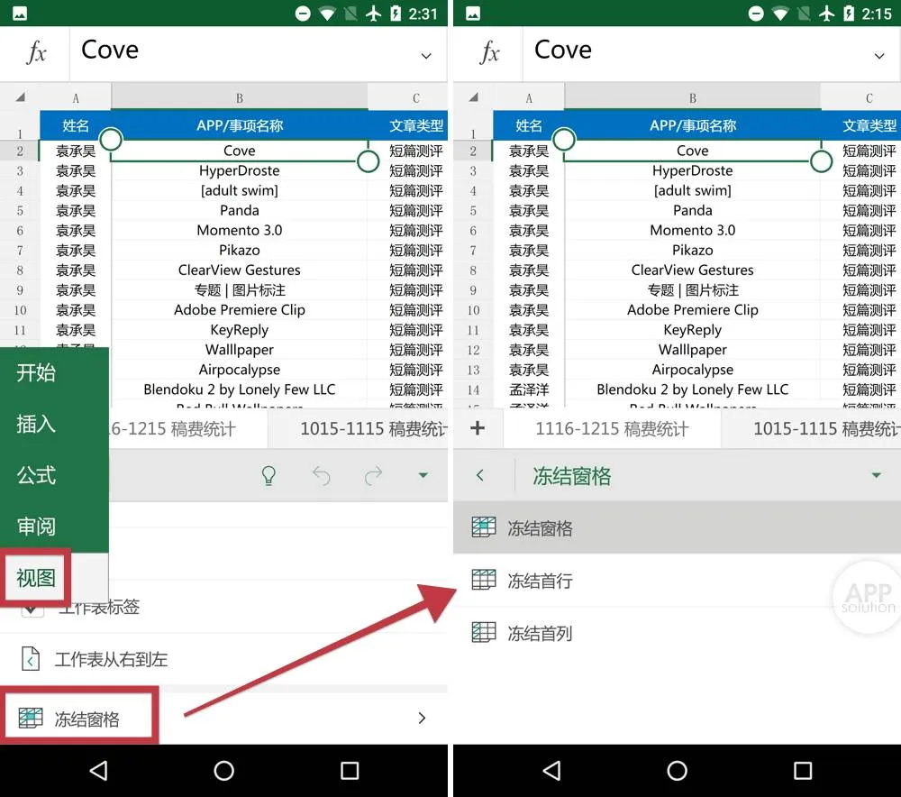 如果你需要使用到这个功能,可以点击 app 顶部的第二个按钮唤出功能选单,再切换到「视图」,在底部即可找到「冻结窗格」。