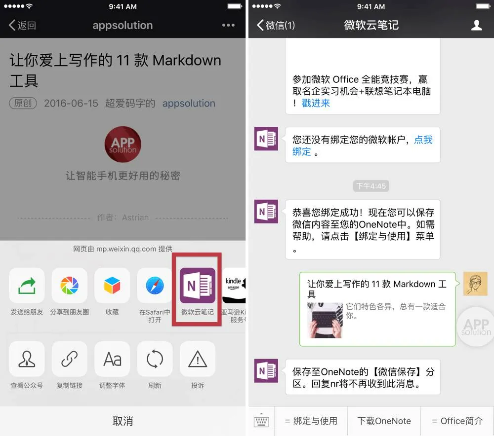 关注微信公众号「微软云笔记」(微信号msmyonenote)并绑定你的微软账号,之后遇到想要收藏的文章,只需要将其转发到「微软云笔记」即可。之后打开 OneNote 即可看到你收藏的微信文章。