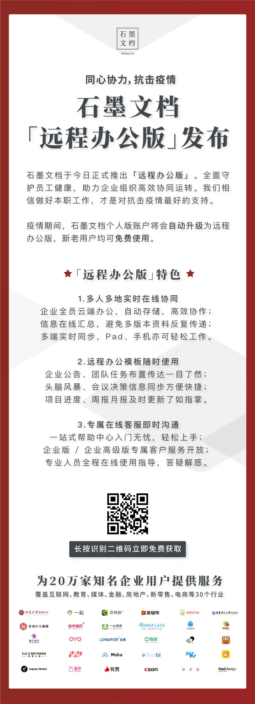 据悉,在疫情期间,石墨文档个人版账户将会自动升级为远程办公版,新老用户均可免费使用,直至疫情结束。