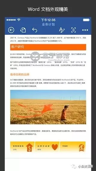 相对于目前 iOS、Android 上任何其他的办公/生产力软件而言(如 WPS、QuickOffice、Documents To Go 等),微软官方的 Microsoft Office for iOS/Android 移动版在文档兼容性和渲染显示排版效果上有着无可比拟的优势,无论是复杂的排版、图标、Excel公式、SmartArt甚至是PPT的切换动画效果等都能完美呈现。