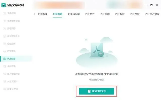 第一步:打开软件,在主页上找到【PDF处理】工具,点击里面的【PDF编辑】功能,就会进入添加文件的页面。