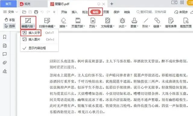 步骤:在WPS软件里打开文件,在工具栏找到【编辑】功能,点击【编辑内容】按钮,就可以对PDF文件进行编辑操作了。