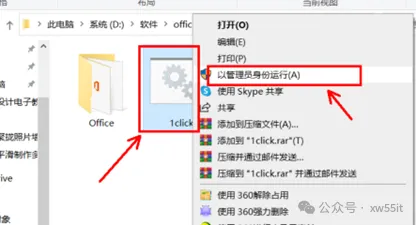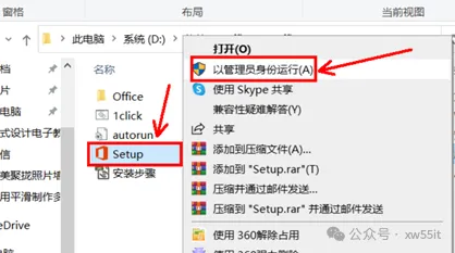 2、双击解压后的Office 365文件夹,鼠标右键点击“setup”(如果是64位系统,打开office文件夹,点击“setup64”),选择“以管理员身份运行”。