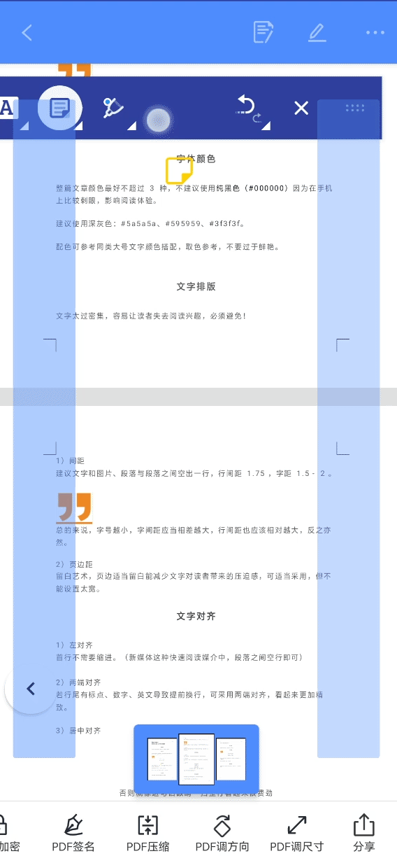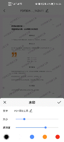 在版权意识格外严谨的今天,文件防盗最好的方法就是添加水印,直接点击【添加水印】就可以输入水印文字啦,除此之外还可以调节文字大小和透明度以及水印的颜色等;