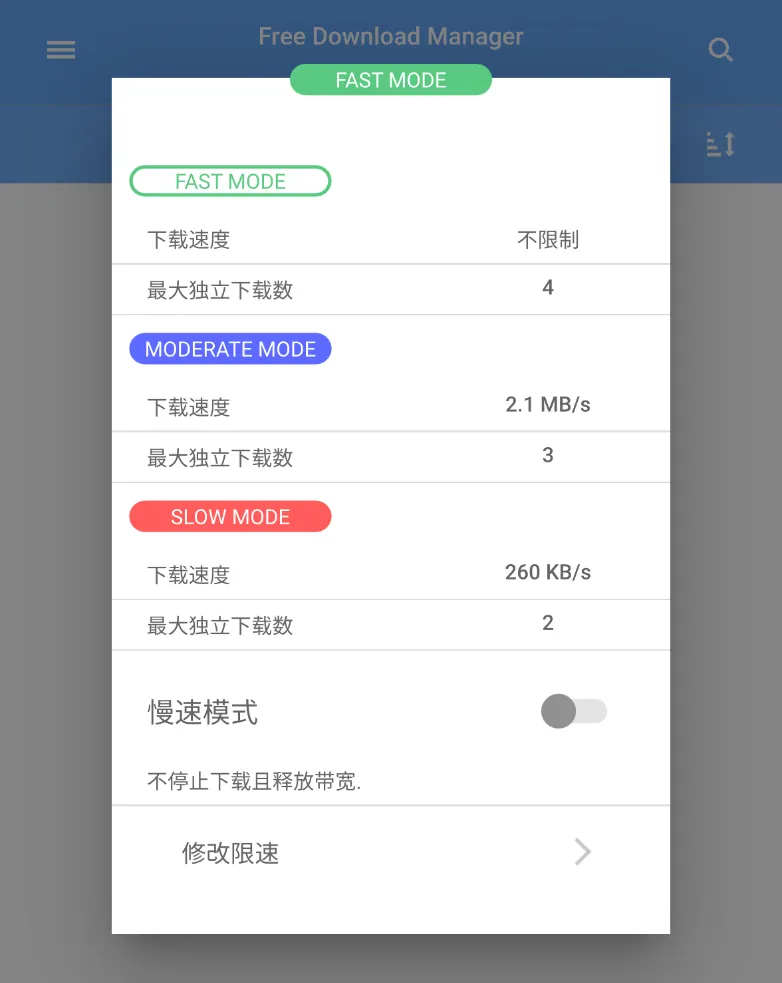 同时,软件还支持几种模式,有速度模式,限速模式以及慢速模式,可以根据自己使用场景来调整内容。