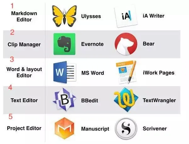 上表是笔者归纳了一下 Mac 下常见的一些写作软件并按功能进行分类。