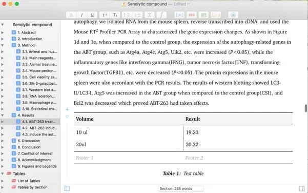 因为写作论文或标书通常都是大工程,既要有框架又要有细节。Manuscripts 的优点是逻辑清晰,上手快,对初学者非常友好,支持 Endnote, Papers 等文献管理软件,而且能友好地插入和呈现 Figure,Table 或相应的占位符,方便谋篇布局 ,它插入的表格直接就是三线表,不用再额外调整格式: