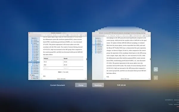 另外, Manuscripts 还集成了 Mac 的一个特色功能,那就是版本管理。写过论文的同学都知道一个论文从初稿到定稿需要改无数个版本,在 Mac 下你不用费心了,只要软件支持,mac 都提供还原到以前版本的功能,比如: