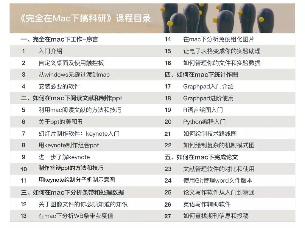不仅包括以上提到的各种写作软件的安装使用,还包括在 Mac 下制作 PPT 、阅读文献、处理数据、分析条带、统计作图、论文写作等等。