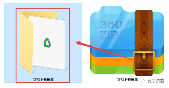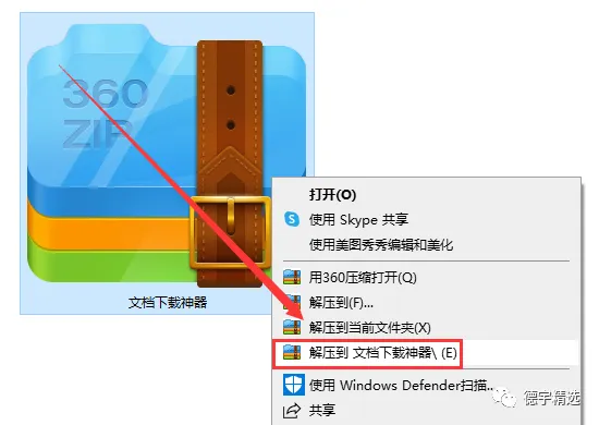 第一步:右键点击安装包【文档下载神器】,弹出框点击【解压到文档下载神器\(E)】