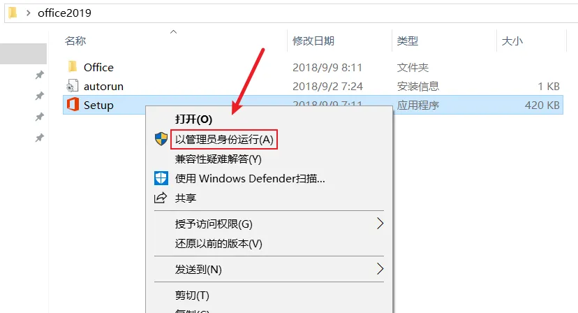 2、解压完成后,找到“office2019”文件夹里的【setup】文件,右击选择“以管理员身份运行”方式进行安装;