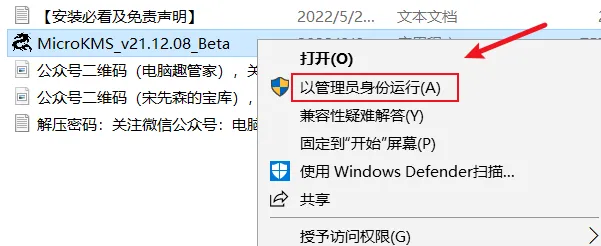 注: 运行激活工具要保持联网正常,才能激活成功。 1、返回到解压好的文件夹找到“MicroKMS_v21.12.08_Beta”文件,右击选择【以管理员身份运行】选项;