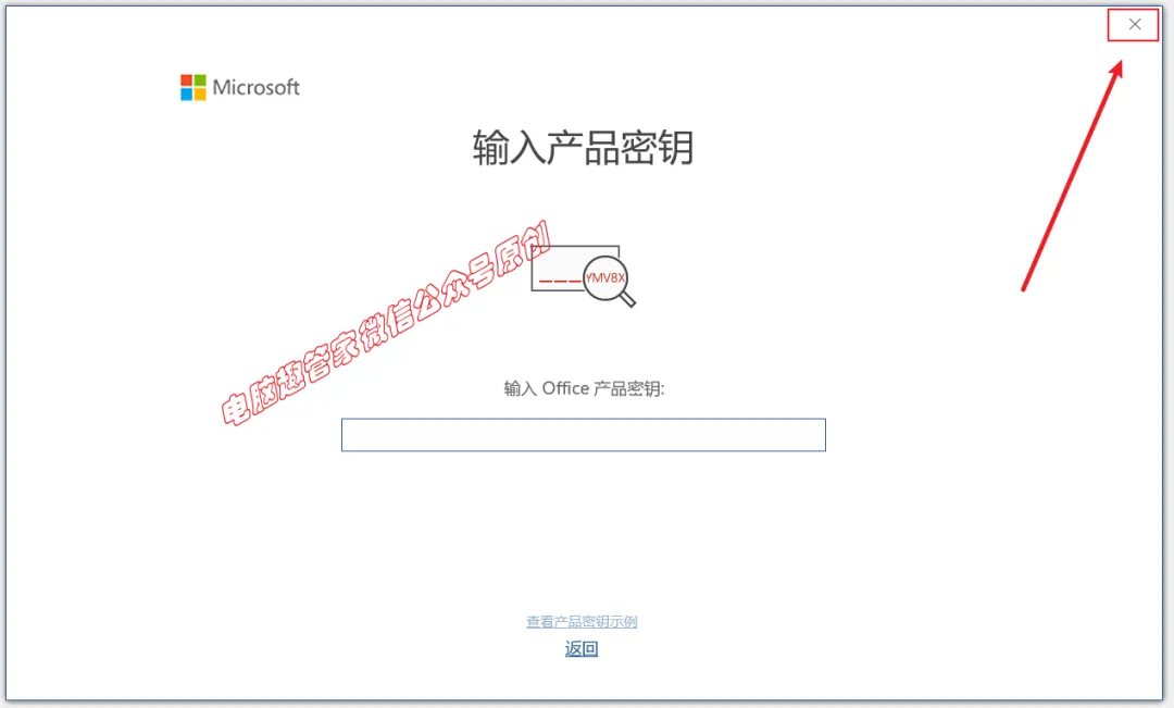 5、打开“word”弹出让“输入产品密钥”的窗口,直接点右上角【x】关闭即可;