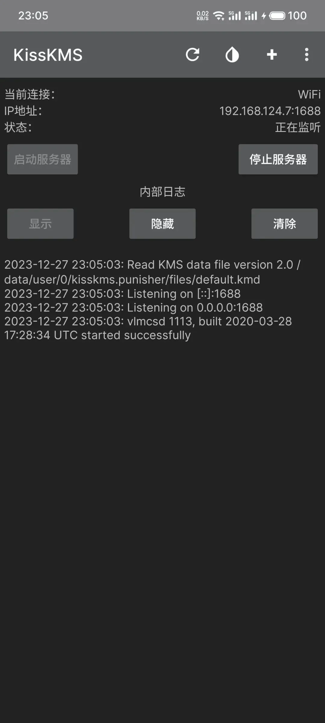 连接好WiFi后,我们只需要点击一下“启动服务器”,这台KMS服务器就已经搭建完成了。